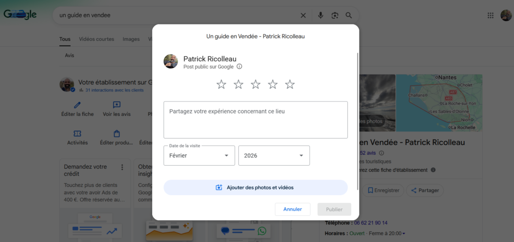Depuis quelques temps il est possible de laisser vos avis directement via google sur les sorties effectuées avec “Un Guide en Vendée”. Pour ce faire (si vous souhaitez indiquer ce que vous avez pensé d’une sortie, ce que je vous incite à faire pour partager votre expérience), il vous suffit de rechercher “Un Guide en Vendée” sur le moteur de recherche, ou de suivre le lien suivant :